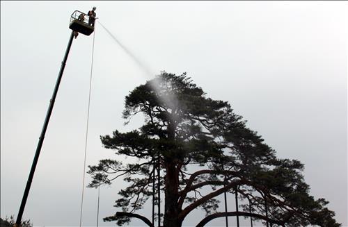 △ 정이품송에 침투한 솔잎혹파리를 퇴치하기 위한 방제작업 장면.