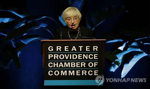 | △ 재닛 옐런 미국 연방준비제도(연준) 의장이 지난 22일(현지시간) 미 로드아일랜드주 프로비던스 지역 상공회의소 연설에서 "올해 안 어느 시점에는 연방기금금리 목표치를 높이기 위한 초기 조치에 나서고 통화정책의 정상화 절차를 시작하는 게 적절하다"고 밝히고 있다. (AP=연합뉴스 자료사진) |
