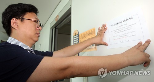 △ 청주시노인병원 폐쇄예정 안내문 (청주=연합뉴스) 김형우 기자 = 31일 오전 청주시 서원구 노인전문병원에서 청주시 관계자가 폐쇄예정 안내문을 현관 출입문에 부착하고 있다. 2015.5.31 vodcast@yna.co.kr
