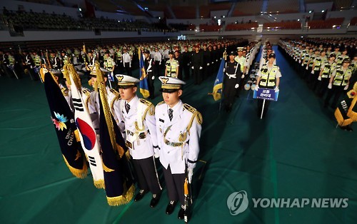 △ '본격 출범' U대회 경찰 전담경비단 (광주=연합뉴스) 박철홍 기자 = 29일 오전 광주 광산구 광주여대 유니버시아드체육관에서 광주 U대회 경찰 전담경비단 발대식이 열려 경비단 소속 경찰관들이 도열해 있다. 2015.5.29 pch80@yna.co.kr