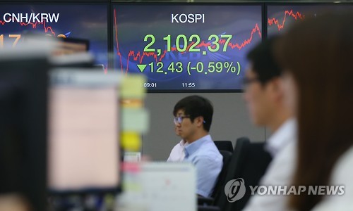 △ 코스피 2,100선 턱걸이 (서울=연합뉴스) 김도훈 기자 = 코스피가 전 거래일보다 12.43포인트(0.59%) 내린 2,102.37로 장을 마감한 1일 오후 서울 중구 외환은행 본점 딜링룸에서 직원들이 업무를 보고 있다. superdoo82@yna.co.kr