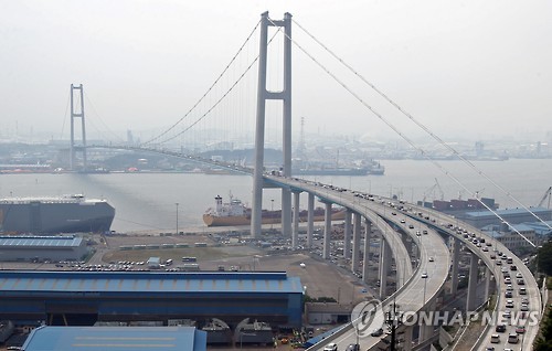 △ '개통' 울산대교 위 차량 행렬 (울산=연합뉴스) 김용태 기자 = 울산대교가 개통한 1일 오후 울산시 동구 염포산에서 바라본 울산대교의 모습. 차량이 대교 위를 줄지어 달리고 있다. 2015.6.1 yongtae@yna.co.kr