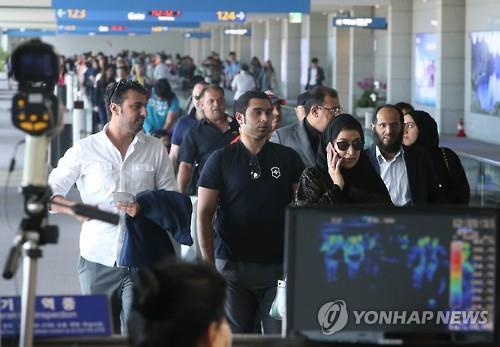 | △ 발열검사 받는 중동발 입국객 (서울=연합뉴스) 김주성 기자 = 메르스(중동호흡기증후군) 감염자가 급격하게 늘어난 가운데, 1일 오후 중동발 여객기를 타고 인천공항에 도착한 외국인들이 발열 감시 적외선 카메라를 통과하고 있다. 2015.6.1 |