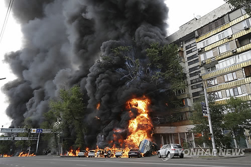 트럭이 정류장에 대기하고 있던 버스들과 충돌하면서 폭발, 일대가 화염에 휩싸여 69명이 숨지고 다수가 부상했다고 적십자사 관계자가 전했다.