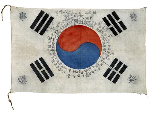 △ '끝나지 않은 이야기전'에 전시된 이철희 사변 폭발 태극기. 이 태극기는 특무 상사 이철희가 6·25 전쟁 때 지니고 있었던 태극기다.