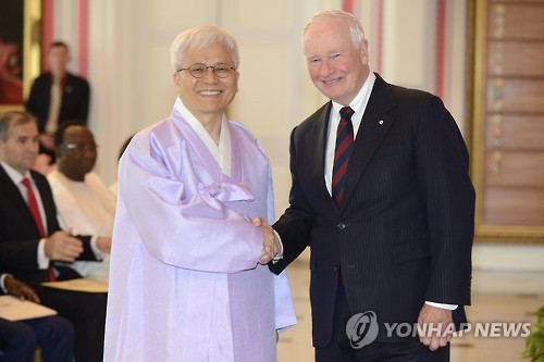 (밴쿠버=연합뉴스) 조재용 통신원 = 조대식 신임 주 캐나다 대사가 1일(현지시간) 데이비드 존스턴 캐나다 총독에게 신임장을 제정했다고 주 캐나다한국대사관이 밝혔다.