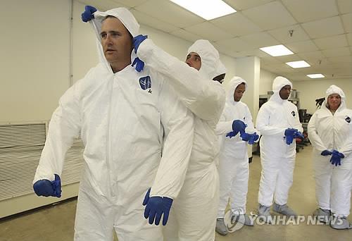 △ 지난해 10월 미국 내 에볼라 감염 환자 발생 당시 보호복을 입는 군인들 (AP=연합뉴스)