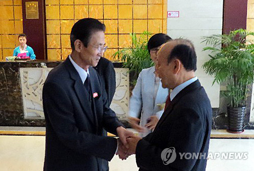 △ 지난달 5일 6·15 남북공동행사 사전 논의를 위해 남측과 북측 대표가 만나는 모습. 왼쪽은 북측 대표인 김완수 6·15공동선언실천 북측위원회 위원장, 오른쪽은 남측 대표인 이창복 상임대표의장. (연합뉴스 자료사진)