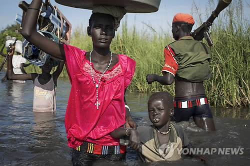 | △ (AP=연합뉴스) 내전상태인 남수단 벤티우에서 누에르족 사람들이 20일(현지시간) 반군들의 호위 속에 유엔남수단임무단(UNMISS)의 난민촌으로 가기 위해 홍수로 허리까지 불어난 개울을 따라 조심스레 걸어가고 있다. marshal@yna.co.kr (AP Photo/Matthew Abbott) |