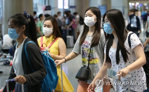 △ 마스크 착용한 외국인 관광객들 (영종도=연합뉴스) 임헌정 기자 = 중동호흡기증후군(메르스) 여파로 유커(遊客·중국인 관광객) 300여명이 한국 여행을 취소한 것으로 나타났다. 지난해 610만명이 방한, 우리나라의 관광·유통산업을 떠받쳤던 '유커 특수'가 메르스 확산으로 타격을 받을 수 있다는 우려가 현실화하고 있다. 사진은 마스크를 착용하고 2일 오후 인천국제공항에 입국하는 외국인 관광객들. 2015.6.2 kane@yna.co.kr