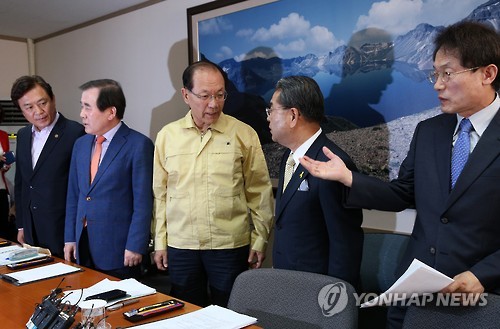△ 황우여, 메르스 발생지역 시도교육감 대책회의 주재 (서울=연합뉴스) 전수영 기자 = 황우여(가운데) 사회부총리 겸 교육부 장관과 이재정 경기도교육감 등 메르스 발생지역 시도교육감들이 3일 오전 정부서울청사에서 대책회의를 하고 있다. 왼쪽부터 김병우 충북교육감, 김지철 충남교육감, 황우여 부총리, 이재정, 조희연 서울시교육감.