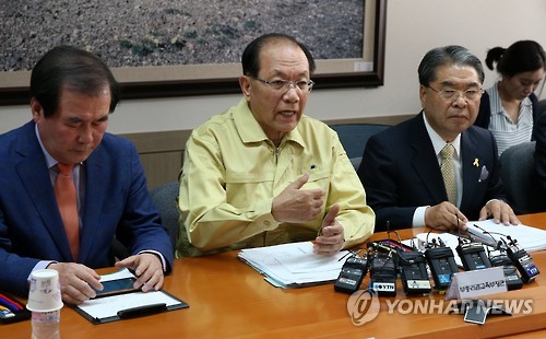 △ 메르스 발생지역 시도교육감 대책회의 (서울=연합뉴스) 전수영 기자 = 황우여 사회부총리 겸 교육부 장관이 3일 오전 정부서울청사에서 열린 메르스 발생지역 시도교육감 대책회의에서 모두발언을 하고 있다. 왼쪽부터 김지철 충남교육감, 황우여 부총리, 이재정 경기도교육감.