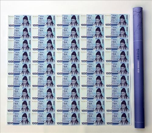 전지은행권은 낱장으로 자르지 않은 전지 형태로, 1천원짜리 지폐가 가로 5장, 세로 9장씩 인쇄돼 있다.