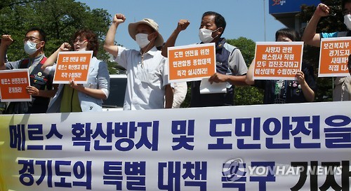 | △ 메르스 대책 촉구 기자회견 (수원=연합뉴스) 신영근 기자 = 3일 오전 경기도 수원 경기도청 앞에서 민주노총 경기도본부 주최로 '메르스 확산 방지 및 도민 안전을 위한 경기도의 특별 대책 촉구 기자회견' 이 열려 참가자들이 메르스 관련 정보 공개 등을 촉구하고 있다. |