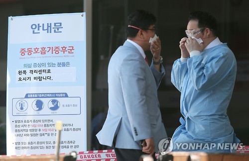 | △ 마스크 고쳐 쓰는 병원 관계자들 (서울=연합뉴스) 박지호 기자 = 3일 오전 연건동 서울대학교병원 응급실 입구에 설치된 메르스 의심환자 격리센터(의심증상 검사 및 임시 수용시설) 앞에서 병원 관계자들이 마스크를 고쳐 쓰고 있다. 2015.6.3 jihopark@yna.co.kr |
