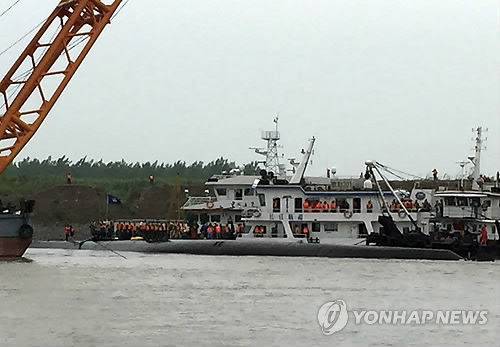 △ 양쯔강 침몰 유람선 구조작업 '제자리걸음' (젠리현<中 후베이성> AP=연합뉴스) 중국 양쯔강 중류 후베이성 젠리현 부근에서 유람선이 침몰한 지 사흘째인 3일(현지시간) 선체에 올라간 구조대원들이 작업을 벌이고 있다. 중국 당국이 수색작업을 가속하며 인명 구조에 총력을 기울이고 있지만 좀처럼 희소식은 들려오지 않고 있다. 현재까지 14명만이 구조됐으며 18구의 시신이 수습, 458명 탑승자 중 약 430명의 생사가 여전히 불투명한 상태다. 2010596@yna.co.kr