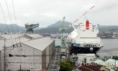 △ 일본 나가사키(長崎)현 나가사키시에 있는 미쓰비시(三菱) 중공업의 나가사키 조선소 내에 설치된 크레인이 3일 오후 인근 언덕에서 내려다보인다.