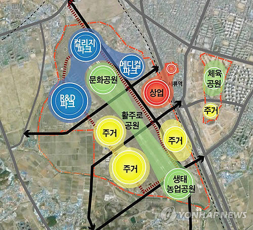 △ 수원공군비행장 개발 계획도 (수원=연합뉴스) 수원시가 마련한 공군비행장 개발 계획도. 시는 수원비행장(525만㎡)의 56.5%를 공원과 도시기반시설로 존치하고 나머지 43.5%(228만㎡)를 분양, 4조5천억원을 재원을 마련할 계획이다. 2014.3.26 <<지방기사 참조, 수원시 제공>> kcg33169@yna.co.kr