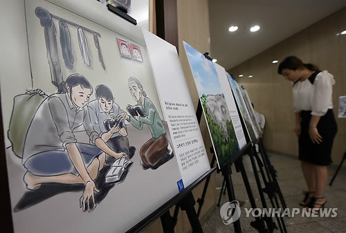 △ '그림으로 알리는 북한 종교박해 실상' (서울=연합뉴스) 김주성 기자 = 지난 2013년 서울 중구 프레스센터에서 북한정의연대와 북한인권개선모임 주최로 열린 '북한의 종교박해 실태 고발 기자회견'에서 한 참석자가 북한의 종교박해 실상을 알리기 위해 증언을 바탕으로 그려진 그림을 관람하고 있다. 2013.7.25 utzza@yna.co.kr