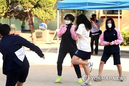 | △ (서울=연합뉴스) 최재구 기자 = 메르스 확진 환자수가 5명 증가한 4일 서울 종로구 안국동 한 고등학교에서 일부 학생들이 마스크를 쓰고 축구 동아리 활동을 하고 있다. 2015.6.4 |