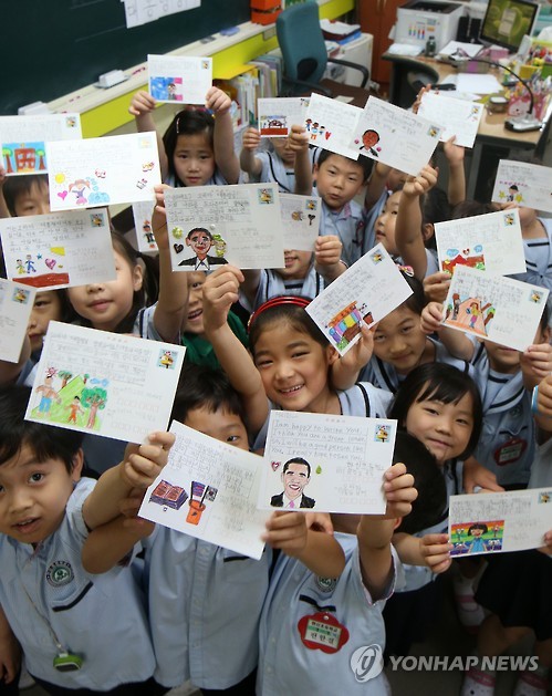 | △ 백악관으로 띄우는 편지 (서울=연합뉴스) 양지웅 기자 = 4일 오전 서울 도봉구 쌍문동 한신초등학교 1학년 학급에서 어린이들이 버락 오바마 미국 대통령에게 쓴 편지를 들어 보이고 있다. 2015.6.4 yangdoo@yna.co.kr |