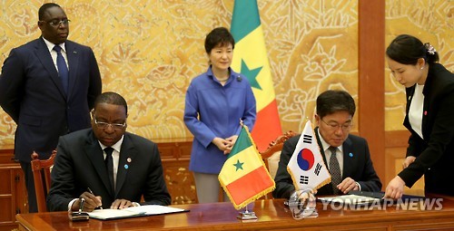 | △ 한-세네갈 통상·산업·투자협력 MOU (서울=연합뉴스) 백승렬 기자 = 윤상직 산업통상자원부 장관(오른쪽)과 은자이 세네갈 외교부 장관이 4일 청와대에서 박근혜 대통령과 마키 살 세네갈 대통령이 지켜보는 가운데 한-세네갈 통상·산업·투자협력 MOU 협정서에 서명하고 있다. srbaek@yna.co.kr |