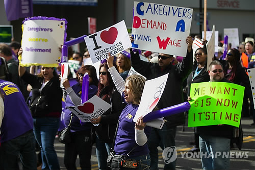 | △ 美 주요도시서 최저임금 인상 연대 시위 (시애틀 AP=연합뉴스) 미국 저임금 노동자들이 시간당 최저임금 인상을 요구하며 15일(현지시간) 전국 주요 도시에서 '15달러를 위한 투쟁'을 벌였다. 이날 시위는 패스트푸드업체 직원들 외에도 공항 노동자, 유통업체 직원, 요양치료사, 보육교사, 시간강사 등 다양한 직종의 저임금 노동자들이 연대해 가세했다. 사진은 자택요양치료사인 마리아 토레스(가운데)가 시애틀에서 시위에 참가, 시간당 최저임금을 15달러(1만6천450원)로 올려달라고 외치고 있는 모습. marshal@yna.co.kr Maria Torres, a home care worker from Pasco, chants during the march a rally for fair wages Wednesday, April 15, 2015, in Seattle. Across the U.S., fast-food and other low-wage workers are calling for protests for a $15 an hour wage in what organizers are calling the biggest ever mobilization of workers. (Bettina Hansen/The Seattle Times via AP) SEATTLE OUT; USA TODAY OUT; MAGS OUT; TELEVISION OUT; NO SALES; MANDATORY CREDIT TO BOTH THE SEATTLE TIMES AND THE PHOTOGRAPHER |