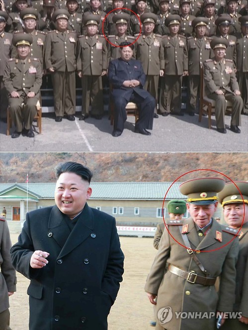 | △ '김정은 경호부대 책임자' 윤정린 대장 계급 복귀 (서울=연합뉴스) 김정은 북한 국방위원회 제1위원장의 경호부대를 책임지고 있는 윤정린 호위사령관이 '대장' 계급으로 다시 복귀한 것으로 5일 확인됐다. 조선중앙TV가 4일 방영한 기록영화의 기념사진 촬영 장면(위)을 보면 윤정린(빨간 원)이 어깨에 별 4개의 대장 계급장을 달고 있는 것이 보인다. 지난해 12월 김정은 제1위원장의 인민군 제963군부대직속 포병중대 시찰 사진(아래)에서 윤정린은 별 3개인 상장 계급장을 달고 있었다. 2015.6.5 nkphoto@yna.co.kr |