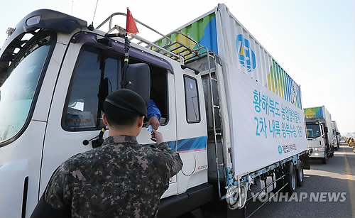 | △ 5·24 조치 후 첫 비료 대북지원 (파주=연합뉴스) 임병식 기자 = 28일 경기도 파주시 통일대교에서 에이스경암의 대북지원 차량이 임진강을 건너기 위해 대기하고 있다. 이날 에이스경암은 복합비료, 온실 건설자재, 영농기자재 등 농업협력물자 컨테이너 22대 분량을 황해북도 사리원시에 전달할 예정이다. 민간단체 대북 비료지원은 지난 2010년 5·24 제재 조치 이후 이번이 5년 만에 처음이다. 2015.4.28 andphotodo@yna.co.kr |