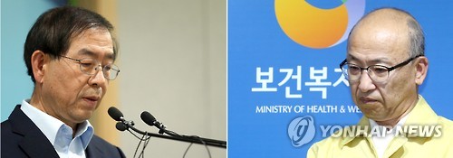 | △ 문형표 장관 vs 박원순 시장 (세종 서울=연합뉴스) 배재만 신준희 기자 = 문형표 보건복지부 장관이 5일 서울시가 전날 중동호흡기증후군(메르스) 의심 의사가 최소 1천500여명 접촉했다고 발표한 것과 관련해 강한 유감을 표명했다. 왼쪽은 이날 정부세종청사에서 브리핑하는 문형표 보건복지부 장관, 오른쪽은 4일 서울시청 브리핑룸에서 메르스 관련 긴급 브리핑하는 박원순 서울시장. |
