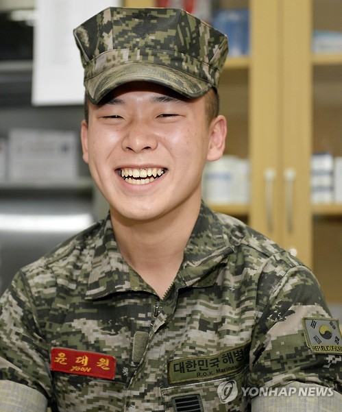 | △ 심폐소생술로 노인 생명 구한 윤대원 병장 (서울=연합뉴스) 휴가 기간 목욕탕에서 심장마비로 의식을 잃은 60대 노인을 심폐소생술로 살려낸 해병대 1사단 소속 윤대원(23) 병장. 2015.6.7 << 해병대 제공 >> photo@yna.co.kr |