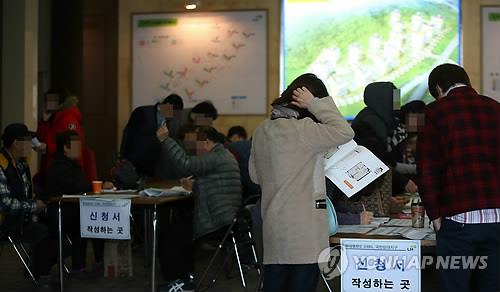 | △ (오산=연합뉴스) 신영근 기자 = 24일 오전 경기도 오산시 세교동 LH 오산사업단 홍보관에서 화성동탄2 24블록 국민임대아파트 예비입주자 추가 모집이 실시돼 많은 시민이 찾아와 신청서를 작성하고 있다. 24블록은 오는 12월 입주 예정으로 이번 추가 모집은 지난해 5월 신규공급 모집 후 해약 등 사유로 발생한 물량에 대한 것이다. 2015.3.24 |