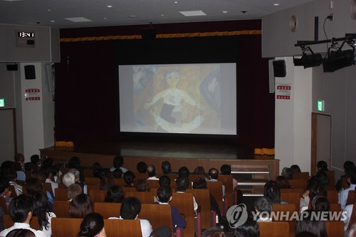 △ 日언론인이 찍은 군위안부 다큐 영화 도쿄서 공개 (도쿄=연합뉴스) 조준형 특파원 = 7일 도쿄 지요다(千代田)구의 히비야 컨벤션홀에서 200여 관객이 객석을 꽉 채운 가운데 프리랜서 언론인 도이 도시쿠니(62·土井敏邦) 씨가 만든 군위안부 다큐멘터리 영화 '기억과 함께 산다'가 처음 상영됐다. 2015.6.7 jhcho@yna.co.kr