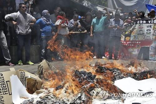 △ 멕시코 중간선거 투표가 치러진 7일(현지시간) 남부 오악사카주에서 교육 개혁법 시행에 반대하는 교원노조원들이 투표 용지를 강탈해 불태우고 있다.(EPA=연합뉴스)
