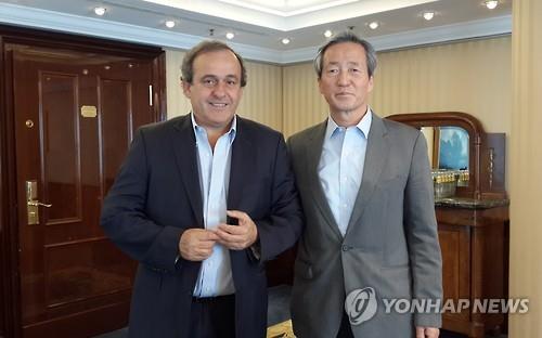 △ 지난 6일 독일 베를린에서 미셸 플라티니 유럽축구연맹(UEFA) 회장을 만난 정몽준 대한축구협회 명예회장.(오른쪽)