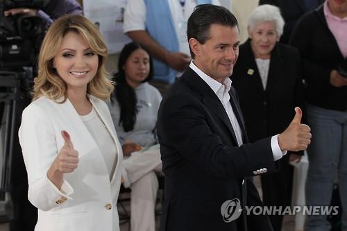 | △ 엔리케 페냐 니에토 멕시코 대통령 부부가 7일(현지시간) 치러진 중간선거에서 투표를 한뒤 엄지를 치켜들어보이고 있다.(EPA=연합뉴스) |