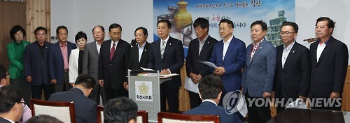 △ 익산시의회 "익산국토청 분리 방안 재검토하라" (익산=연합뉴스) 전북 익산시의회 의원들이 8일 시의회 청사에서 호소문을 내고 "행정자치부는 익산지방국토관리청을 전북청과 전남청으로 분리·재배치하려는 계획을 전면 중단하고 재검토하라"고 촉구하고 있다. 2015.6.8 << 익산시의회 >> sollenso@yna.co.kr