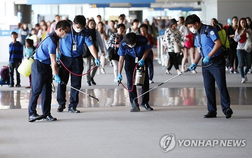 △ '메르스 차단' 위해 공항 방역 (영종도=연합뉴스) 신준희 기자 = 메르스(중동호흡기증후군) 격리 대상자가 1천364명으로 늘어나면서 감염에 대한 국민들의 공포와 우려가 더욱 심화된 가운데 3일 오후 영종도 인천국제공항 입국장에서 방역업체 직원들이 방역 작업을 하고 있다. 2015.6.3 hama@yna.co.kr