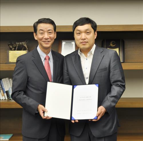 | △ 권용원(왼쪽) 키움증권 사장과 서정훈 제너럴바이오 사장이 기업공개(IPO) 대표주관 계약을 체결한 후 기념촬영을 하고 있다.<<사진제공=키움증권>> |