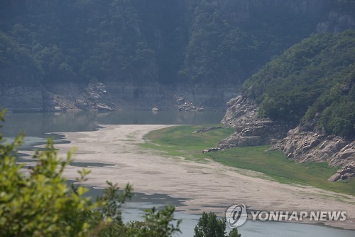 △ '모래사장 아닙니다' 바닥 드러낸 충주호 (단양=연합뉴스) 공병설 기자 = 가뭄이 계속되는 가운데 7일 충북 단양군 단성면 장회나루 부근 충주호 상류지역이 군데군데 바닥을 드러내고 있다. 2015.6.7 kong@yna.co.kr