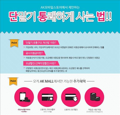(서울=연합뉴스) 이도연 기자 = AK플라자가 운영하는 온라인종합쇼핑몰 AK몰(www.akmall.com)은 온라인몰로는 최초로 휴대전화 선택약정할인 상품을 판매한다고 9일 밝혔다.