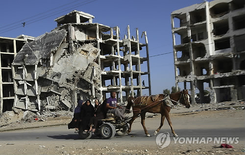 △ 전쟁 상흔 밴 가자지구 일상 (베이트라히야<가자지구> AP=연합뉴스) 마차를 탄 팔레스타인인 가족이 2일(현지시간) 작년 여름 이스라엘과 팔레스타인 무장정파 하마스 사이의 교전 당시 파괴된 가자지구 북부 베이트 라히야 지역의 건물들을 지나치고 있다. 2010596@yna.co.kr Palestinian family members ride a horse cart as they pass apartment buildings that were destroyed in the last summer's Israel-Hamas war, in the residential neighborhood of Beit Lahiya in the northern Gaza Strip, Tuesday, June 2, 2015. (AP Photo/Adel Hana)