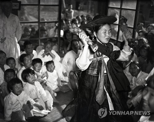 △ 돼지족발 든 무녀 (부산=연합뉴스) 김선호 기자 = 1948년 한 무녀가 양손에 돼지족발을 하나씩 들고 굿을 펼치고 있다. 동네 꼬마 녀석들과 부녀자들이 빽빽하게 모여 앉아 굿 구경을 하고 있다. 이 사진은 당시 국내에 있던 한 미군이 촬영한 것으로 김한근 부경근대사료연구소 소장이 미국의 한 수집가로부터 입수했다. 2015.6.9 << 부경근대사료연구소 제공 >> wink@yna.co.kr