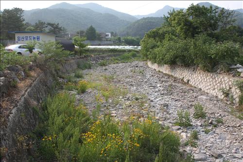 지난 9일 오후 마을에 들어서며 보니 하천엔 물 흔적조차 안 보였다. 돌로 뒤덮인 하천 바닥은 황량했고 먼지까지 날렸다.