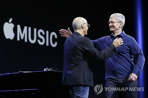△ 애플 뮤직은 애플이 작년에 인수한 '비츠 뮤직'과 기존의 '아이튠스 라디오' 서비스를 결합한 것으로 24시간 중단 없이 돌아가는 플레이리스트 방식 글로벌 라디오 '비츠 원'과 함께 운영될 예정이다. 사진은 지난 8일(현지시간) 미국 샌프란시스코에서 열린 연례 세계개발자회의(WWDC)에서 팀 쿡 애플 최고경영자(오른쪽)와 지미 아이오빈 비츠 공동창업자가 포옹하는 모습. (AP=연합뉴스)