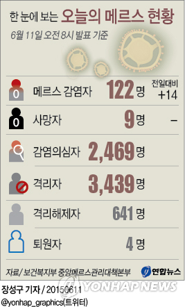 (서울=연합뉴스) 김태균 기자 = 중동호흡기증후군(메르스) 확진자가 14명 늘어 전체 환자가 122명으로 집계됐다고 보건복지부가 11일 밝혔다.
