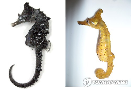 △ 87년 만에 실체 밝혀진 한국 대표 해마 (부산=연합뉴스) 부경대 한상윤 연구원이 87년 만에 실체를 밝힌 우리나라 대표 해마(왼쪽)와 그동안 같은 종으로 인식됐던 일본 해마 '히포캄푸스 코로나투스'. 정수리에 난 뿔 모양의 돌기와 주둥이 비율이 확연하게 다르다. (부경대 제공)