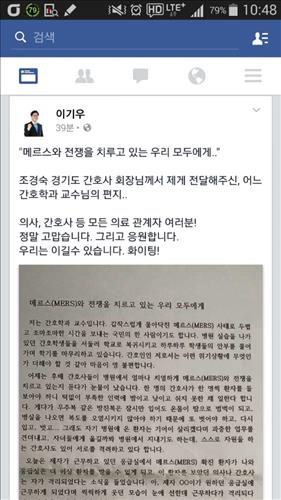 11일 오후 이기우 경기도 사회통합부지가 자신의 페이스북에 조경숙 경기도 간호사 회장이 보낸 글을 올렸다.