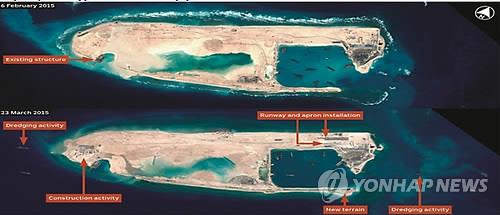 | △ 중국이 남중국해 영유권 분쟁도서인 스프래틀리군도(중국명 난사<南沙>군도)에 건설중인 인공섬과 활주로 등의 위성사진 모습. << IHS 제인스디펜스위클리 제공 >> photo@yna.co.kr |