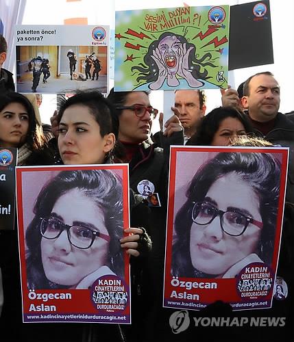 | △ (AP=연합뉴스 자료사진) 지난 2월 터키 여성단체 등이 잔혹하게 살해된 여대생 외즈게잔 아슬란씨의 사진을 들고 여성폭력 근절을 촉구하는 시위를 벌였다. |